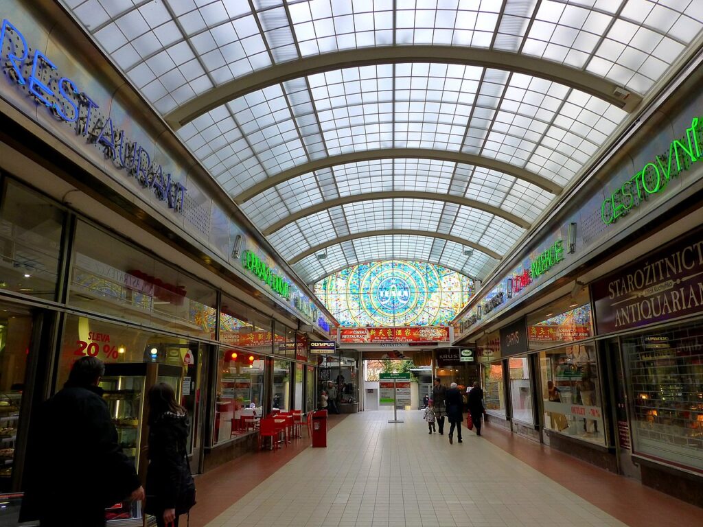 However, the passage we see today was born in 1936, designed to reflect a new urban trend of modern shopping arcades inspired by the grand boulevards of Paris and Berlin. It became a symbol of the young Czechoslovak Republic’s optimism.
